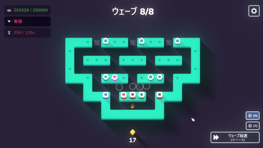 ただ同じタワーを買っていると値段が上がってくるので、他のタワーを混ぜても構わないと思います。ちょっと考えないとクリアできなかったので、程よい難易度かと思いました。