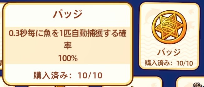 ランダムで入手できるお宝「バッジ」は、0.3秒ごとに確率でどんどん魚を釣り上げていくようになる強力なお宝です。これを入手した段階で放置も可能になります。