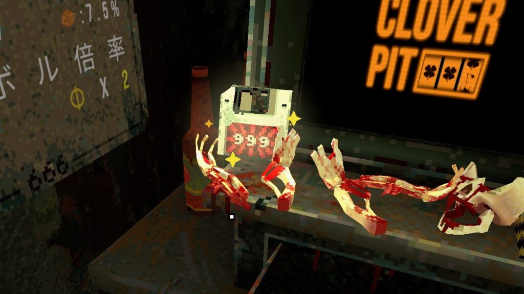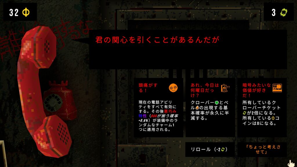 最初のラウンド開始時に電話がかかってきますが、赤いセリフはどうやら悪魔らしく無視しないといけません。これを3回繰り返します。無視するごとにスロットマシンのそばにあるフロッピーディスクの6の数字に傷がついていきます。