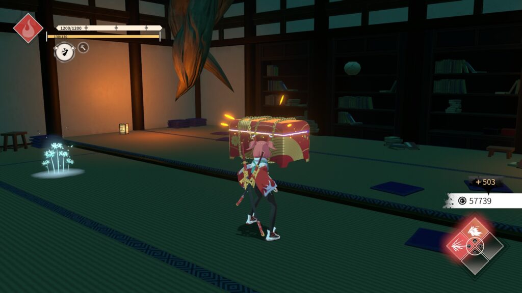序盤の城の屋根を飛び越えて行くルートの後ろにあるので見逃しやすいです。中身は癒守。