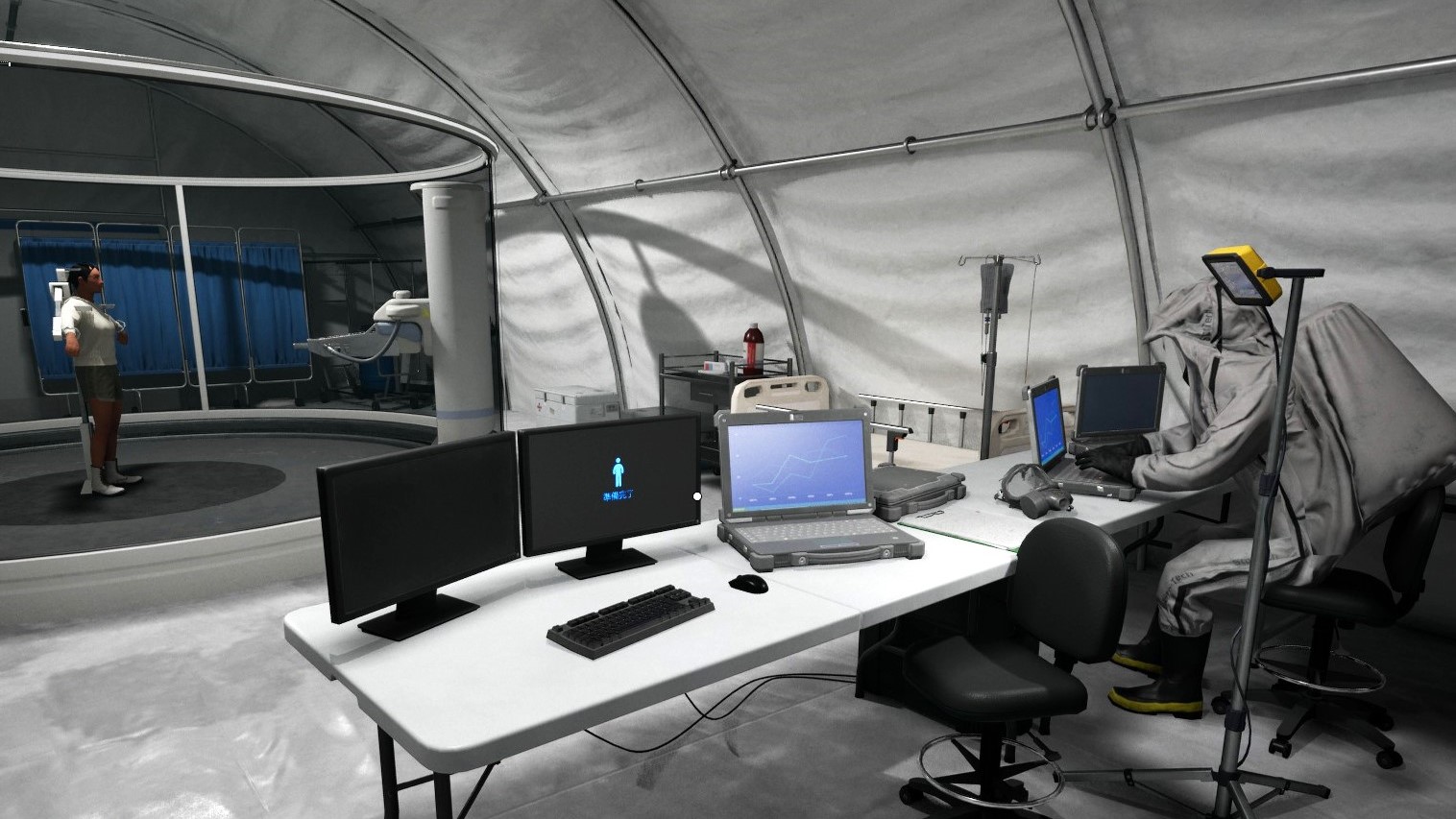 X線をつかって内臓を透過し感染してるかをチェックします。何かしらの症状がある感染者はお腹を押さえて前かがみになることが多いですね。