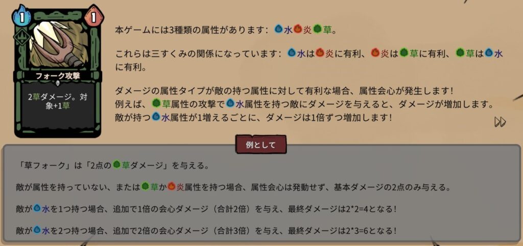 例えばシーフの水属性のカードで敵を攻撃すると敵に属性が付与されます (最大5まで)。この後に大ダメージを狙えるのが農夫の属性の攻撃です。