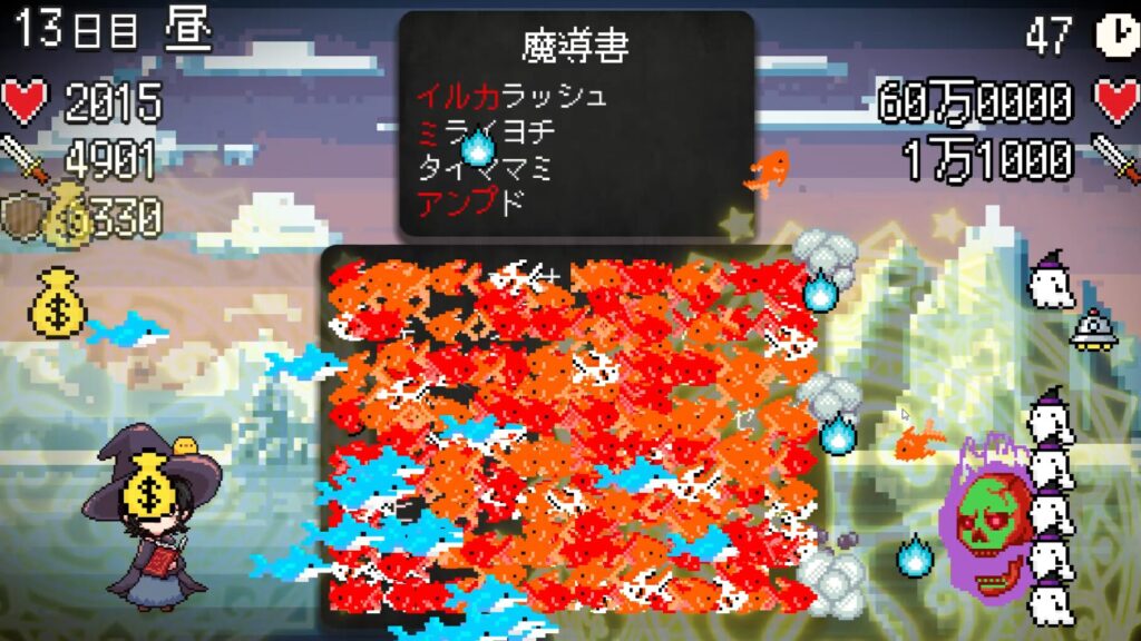 召喚にイルカやペンギンがいますが、彼らは敵の弾を防いでくれたりするので便利です。特に詠唱を手伝ってくれるキンギョはレベルを上げていくと自動でどんどん魔法を唱えていってくれるので強力な相棒となります。
