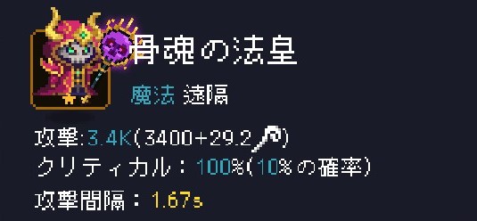 プレイヤーの周りをガイコツがグルグル回るのですがこれがかなり高威力。移動速度をあげるととても楽しくなります。