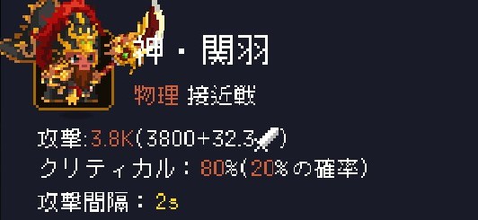 偃月刀で広範囲を薙ぎ払います。4回に1回超ダメージ&物攻がアップしていくので、序盤で仲間にすると終盤には物理攻撃力モリモリになります。