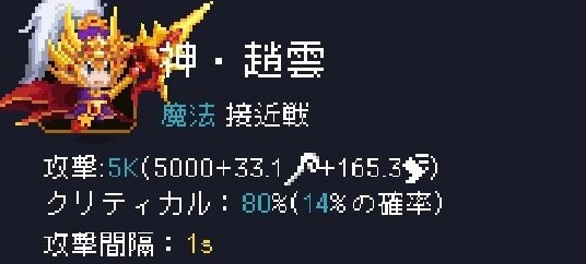 趙雲の神バージョン。こちらはノーマルと比べ大分離れてても一人で戦うようになりました。さらに麻痺攻撃も習得しているので、敵を行動不能にしたまま葬っていきます。