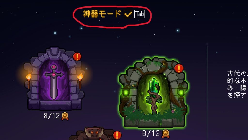 通常の装備とは異なるシステムを採用したモードで、より強力で細かいビルドを組むことが可能になっています。ステージ選択画面の上部で神器モードを選ぶとONになります。