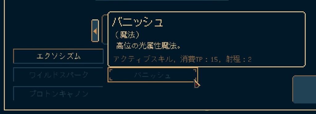 最初で中級2属性を習得確定しているキャラを作るのもアリです。画像では見にくいですが、レベルが上がると「ワイルドスパーク」「バニッシュ」を習得できるので、あとは味方に教えていくだけとなります。