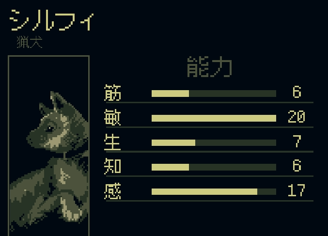ステージ2の焚き火で仲間になる所でランダムで発生。他の場所もあるかもしれません。敏捷と感知が異常に高く、味方の攻撃の後にさらに攻撃を加える「追撃」スキルを持っているので、あとは筋力を伸ばしてあげれば超強力ワンコになります。
